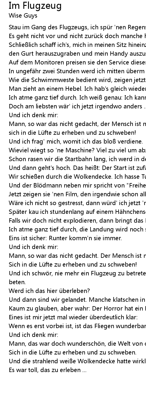 | Und ich schwör, nie mehr ein Flugzeug zu betreten. Ich kann plötzlich wieder beten. | |