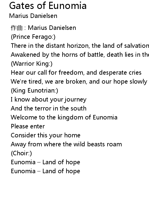 | [01:28.086] | Welcome to the kingdom of Eunomia |
