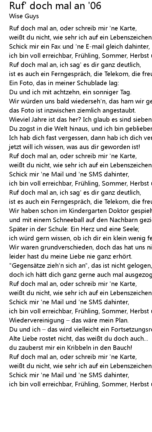 | Ruf doch mal an, oder schreib mir 'ne Karte, | |