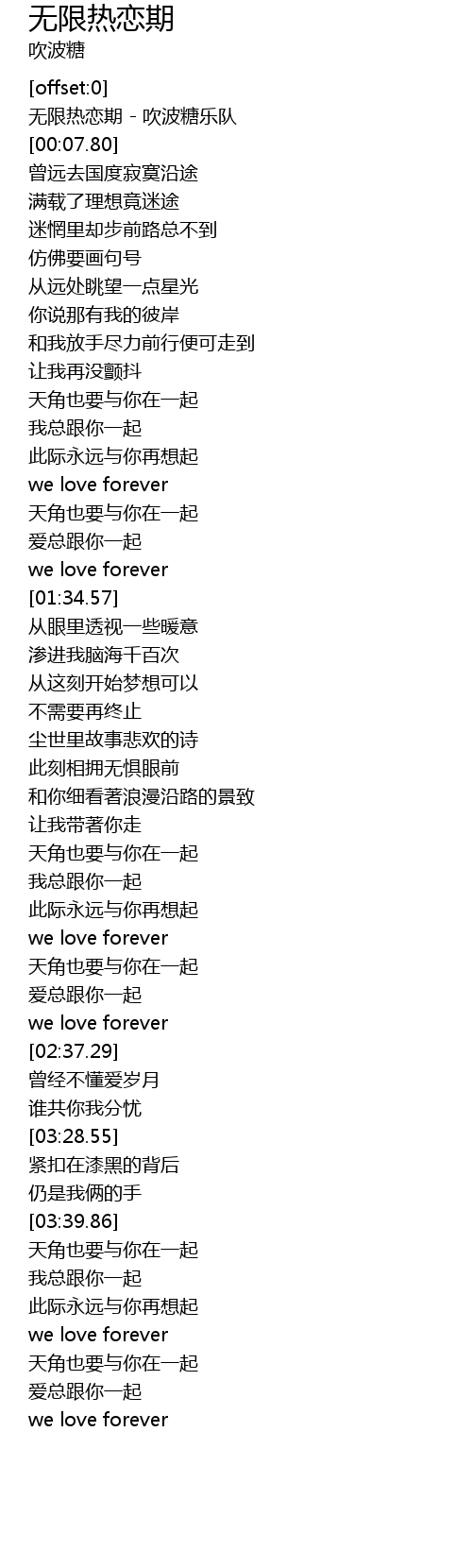 | [00:01.42] | 无限热恋期 - 吹波糖乐队 |