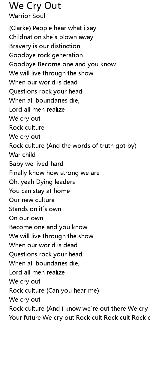 | Rock culture And i know we re out there We cry out Rock culture We cry out Your future We cry out Rock cult Rock cult Rock cult Rock culture |