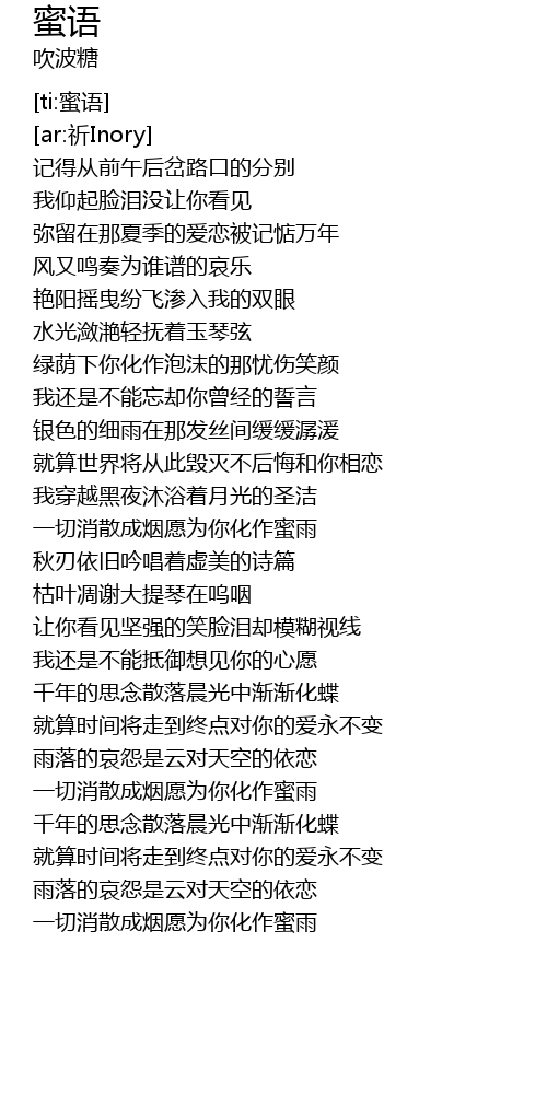 | [03:48.226] | 一切消散成烟愿为你化作蜜雨 |