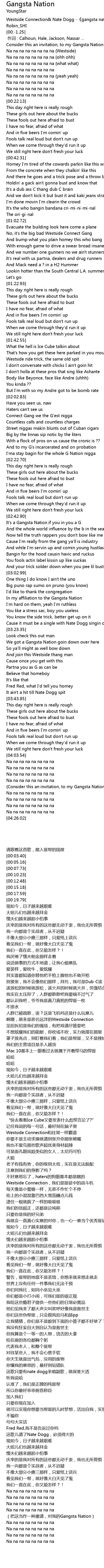 | [00:00.11] | Consider this an invitation, to my Gangsta Nation |