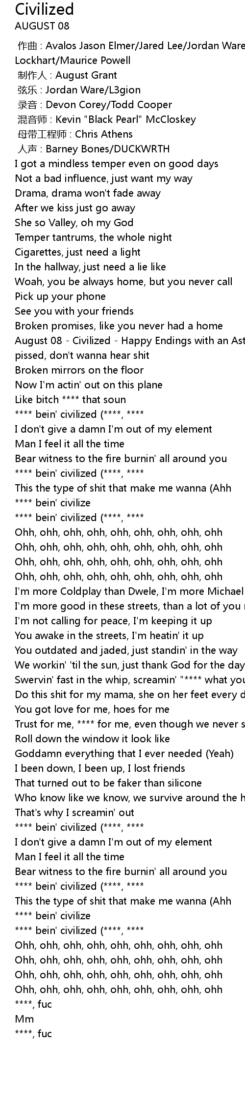 | [00:43.68] | August 08 Civilized Happy Endings with an Asterisk Now I' m real pissed, don' t wanna hear shit |