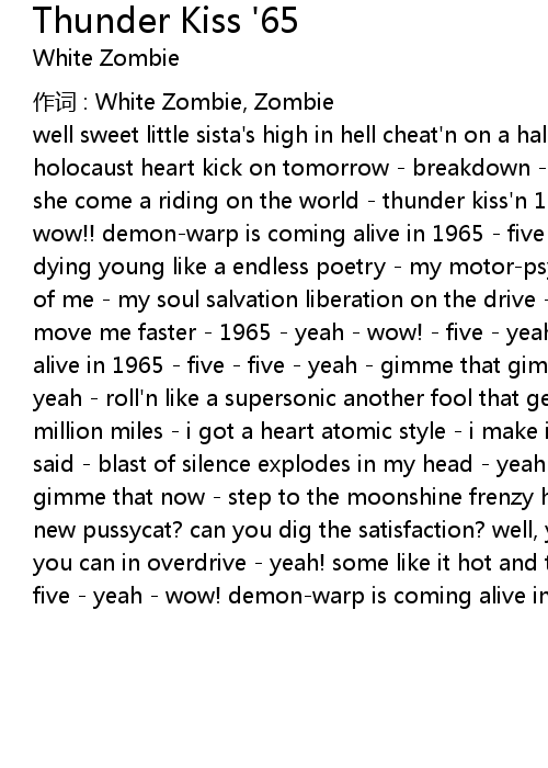 | well sweet little sista's high in hell cheat'n on a halo - grind in a odyssey holocaust heart kick on tomorrow - breakdown - agony said "ectasy" in overdrive she come a riding on the world - thunder kiss'n 1965 - yeah - wow! five - yeah - wow!! demon-warp is coming alive in 1965 - five - five - yeah - livin' fast and dying young like a endless poetry - my motor-psycho nightmare freak out inside of me - my soul salvation liberation on the drive - the power of the blaster move me faster - 1965 - yeah - wow! - five - yeah - wow! - demon-warp is coming alive in 1965 - five - five - yeah - gimme that gimme that now - now - now - yeah - roll'n like a supersonic another fool that gets down on it - pig sweat a million miles - i got a heart atomic style - i make it look easy - that's what i said - blast of silence explodes in my head - yeah - yeah - yeah - gimme that gimme that now - step to the moonshine frenzy hail: the ressurection - what's new pussycat? can you dig the satisfaction? well, you can't take it with you but you can in overdrive - yeah! some like it hot and twist'n, 1965 - yeah - wow! - five - yeah - wow! demon-warp is coming alive in 1965 - five - five |