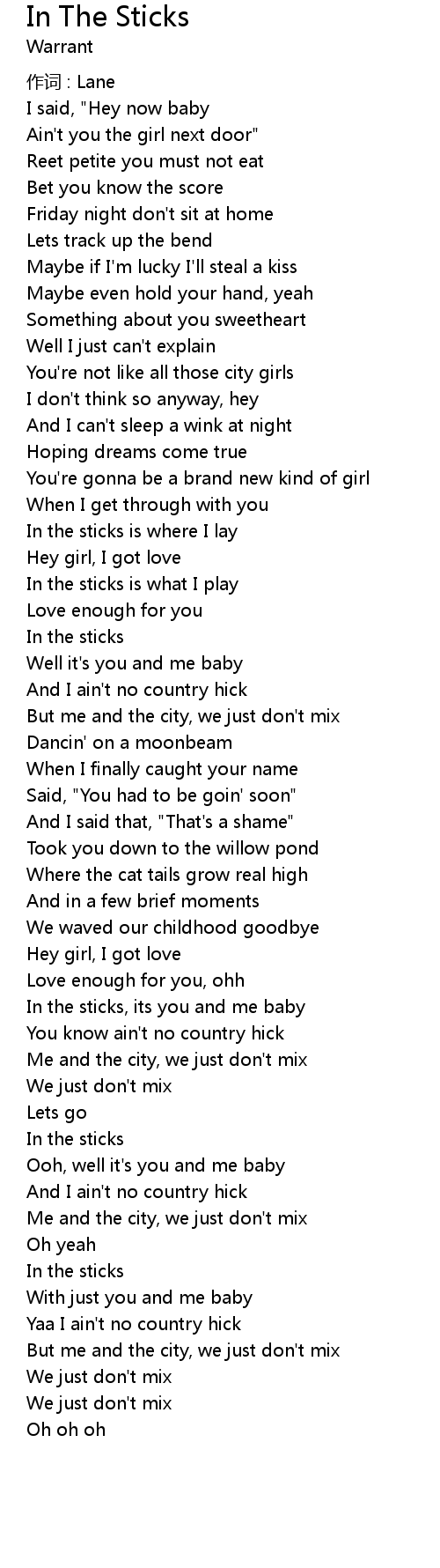 | In the sticks, its you and me baby | |