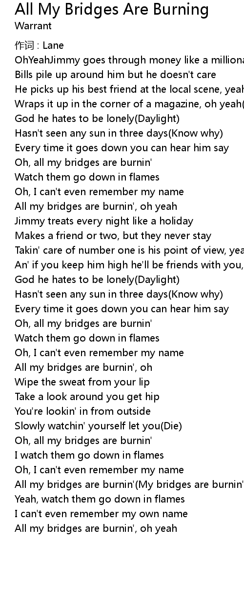| All my bridges are burnin' My bridges are burnin' | |