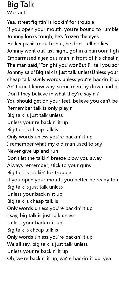 Johnny said"Big talk is just talk unlessUnless your backin' it upBig talk is cheap talk isOnly words unless you're backin' it up" |