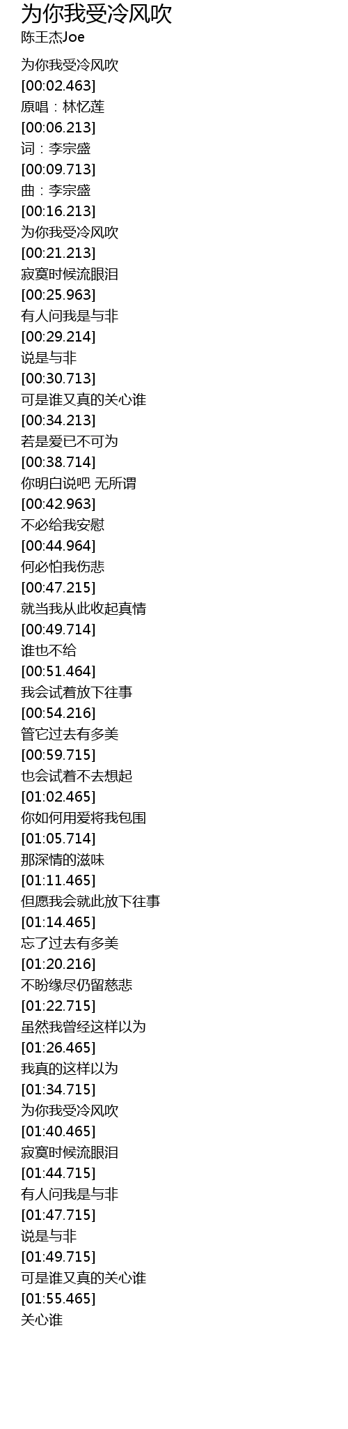 | [00:00.464] | wèi nǐ wǒ shòu lěng fēng chuī |