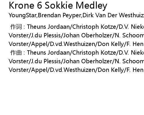 | [00:00.00-1] | zuò qǔ : Theuns Jordaan Christoph Kotze D. V. Niekerk F. Skead J. Vorster J. du Plessis Johan Oberholzer N. Schoombee R. Wessels S. Butler A. Vorster Appel D. vd. Westhuizen Don Kelly F. Henning |