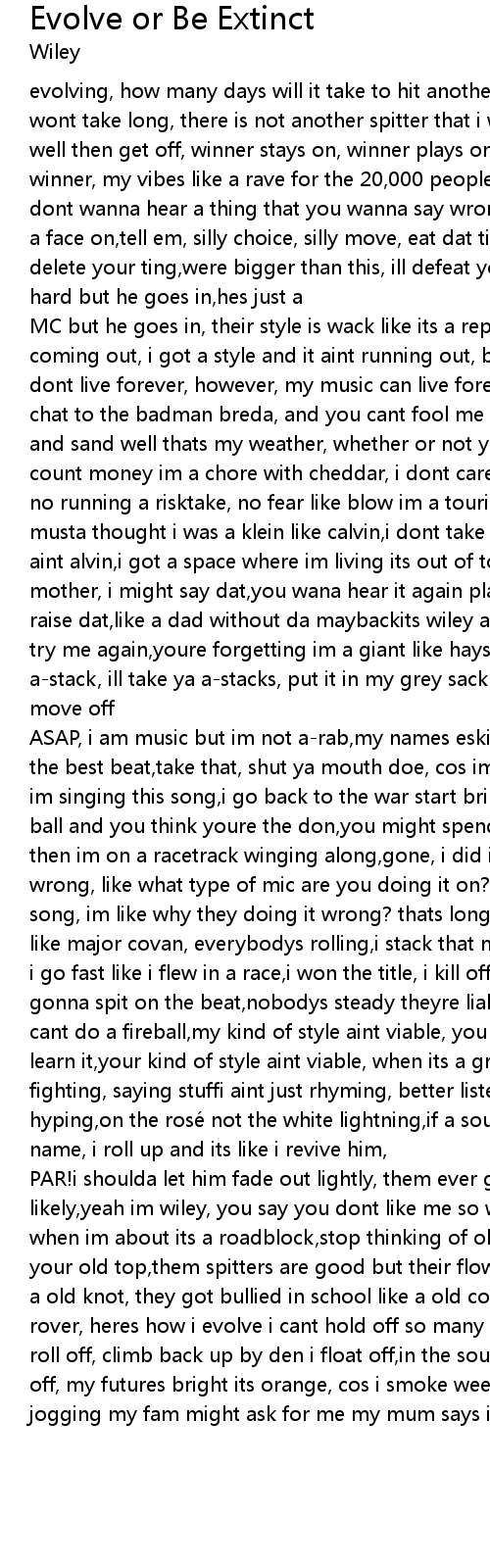 | PAR!i shoulda let him fade out lightly, them ever getting anywhere werent likely,yeah im wiley, you say you dont like me so what, im not a showoff,but when im about its a roadblock,stop thinking of old songs, move on, go change your old top,them spitters are good but their flows not,as tight as mine im like a old knot, they got bullied in school like a old cop,god im in control im not a rover, heres how i evolve i cant hold off so many chattingon a cliff but they roll off, climb back up by den i float off,in the souls confront until it goes off, my futures bright its orange, cos i smoke weednot brown in a sorange,i go jogging my fam might ask for me my mum says i aint seen nothing of him. |