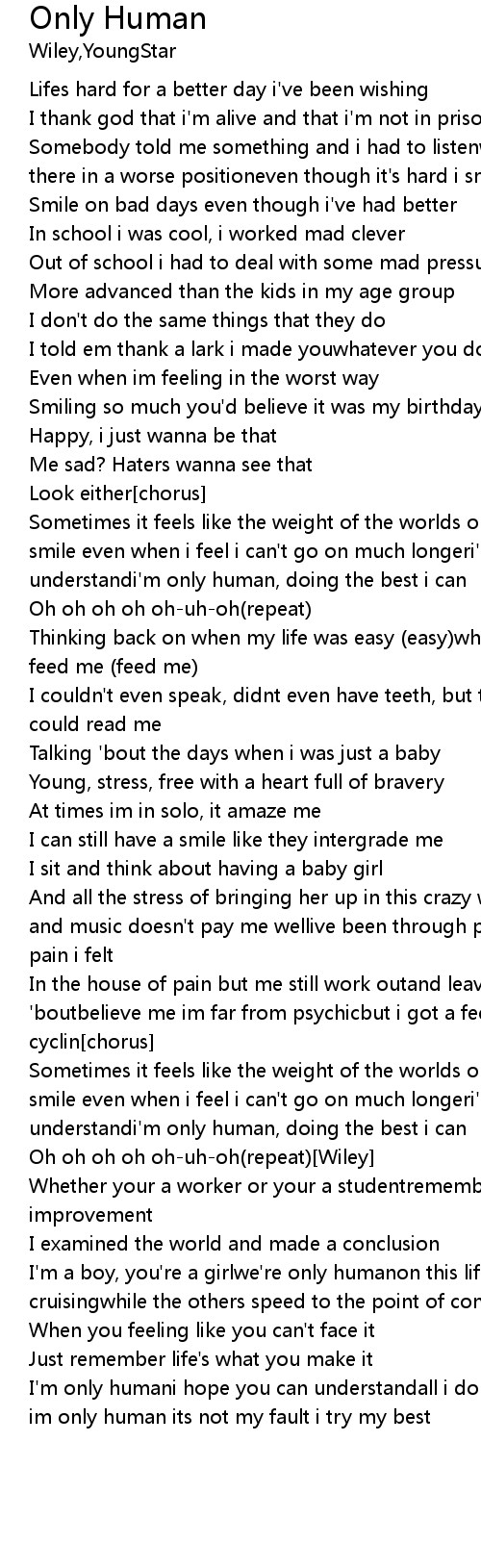 | Sometimes it feels like the weight of the worlds on my shouldersand i still smile even when i feel i can't go on much longeri'm only human and i hope you understandi'm only human, doing the best i can | |