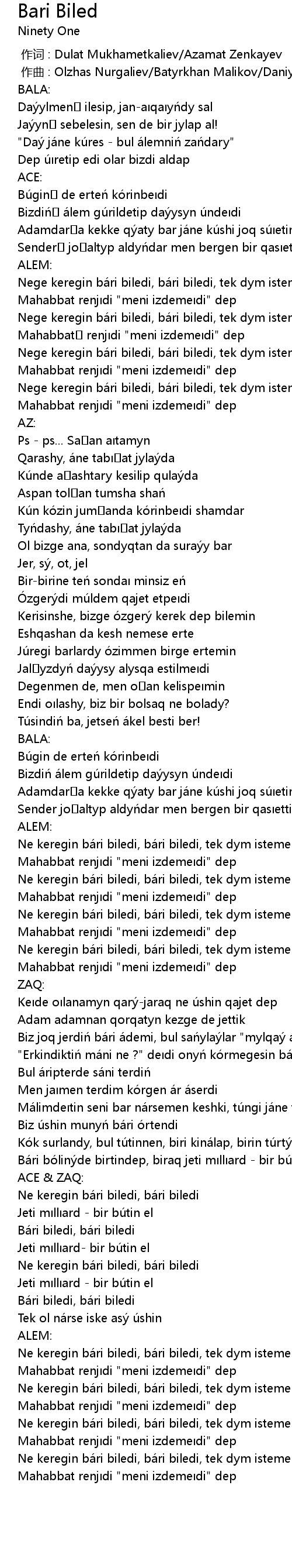 | [00:56.51] | Nege keregin bári biledi, bári biledi, tek dym istemeıdi |
