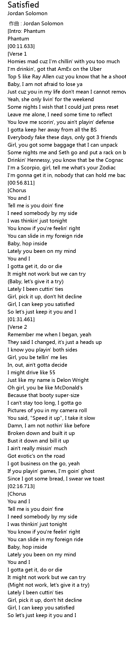 | [01:27.216] | Girl, I can keep you satisfied |