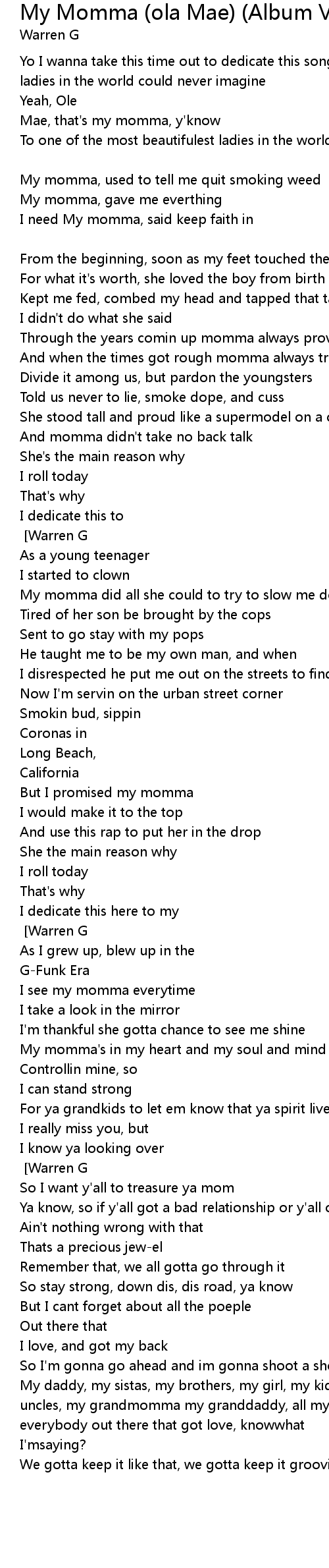 God My momma, momma, momma, momma, momma [Warren G]