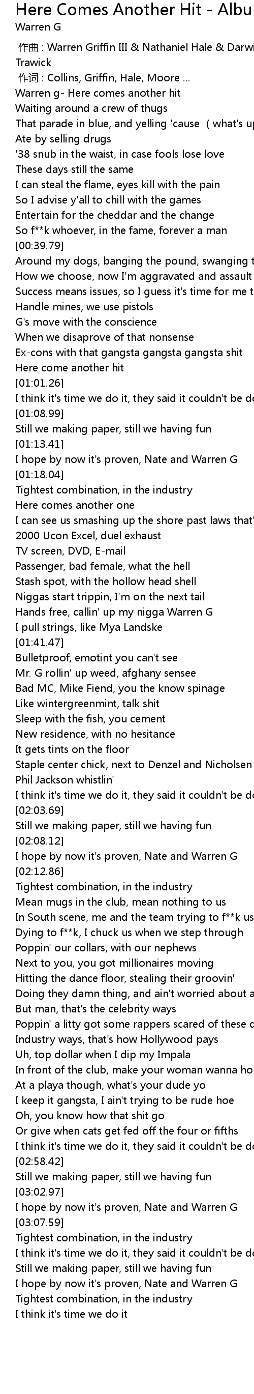 | [00:00.49] | Warren g Here comes another hit |