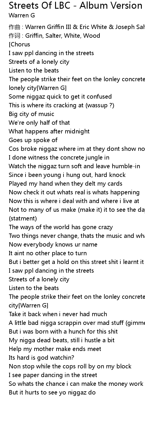 | The people strike their feet on the lonley concrete streets of.. streets of a lonely city Warren G | |