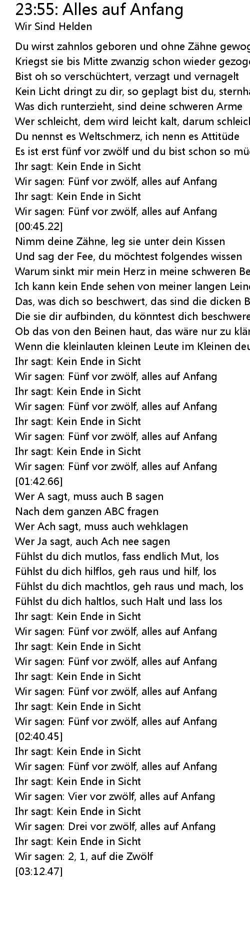 | [03:02.08] | Wir sagen: Vier vor zwölf, alles auf Anfang |
