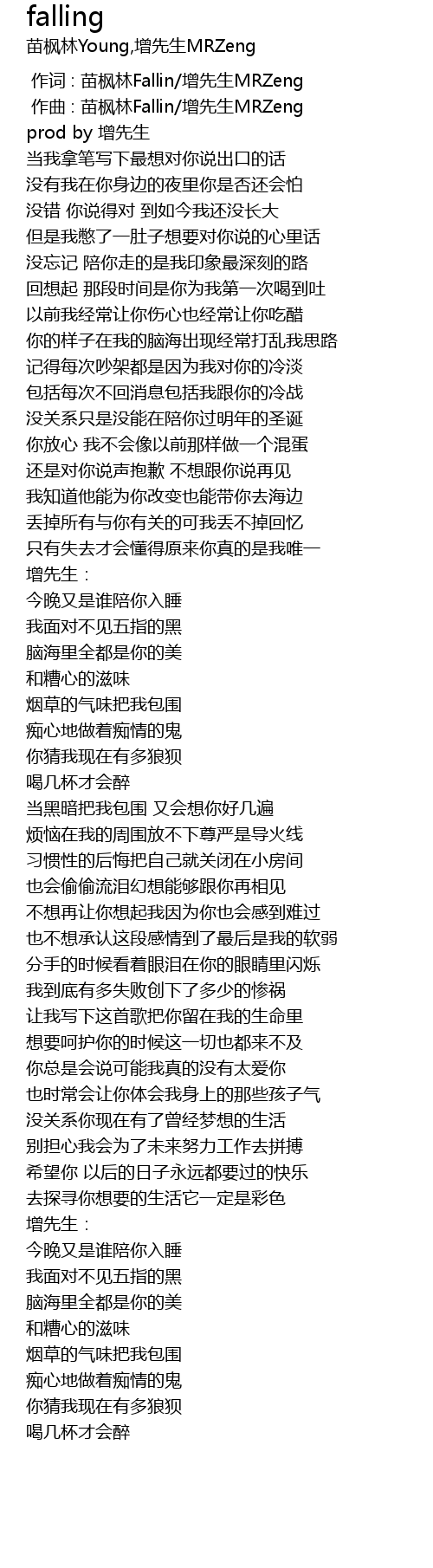 | [00:01.000] | zuò qǔ : miáo fēng lín Fallin zēng xiān shēng MRZeng |