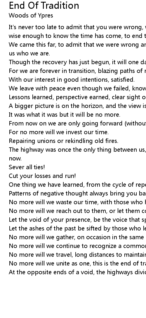 It's never too late to admit that you were wrong, when the journey has made you wise enough to know the time has come, to end the tradition. |