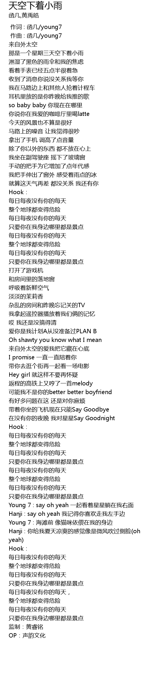 | [02:15.80] | Young 7 : say oh yeah yì qǐ kàn zhe xīng xīng tǎng zài wǒ yòu miàn |