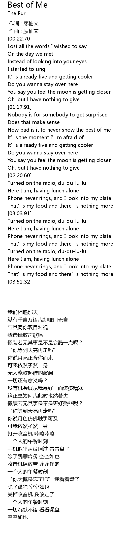 | [03:17.44] | Phone never rings, and I look into my plate |