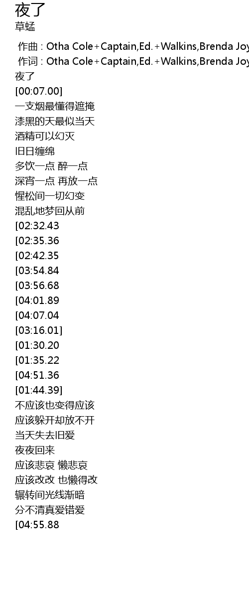 | [04:43.38][03:54.84][03:10.34][02:51.44][01:13.62] | 夜了 |