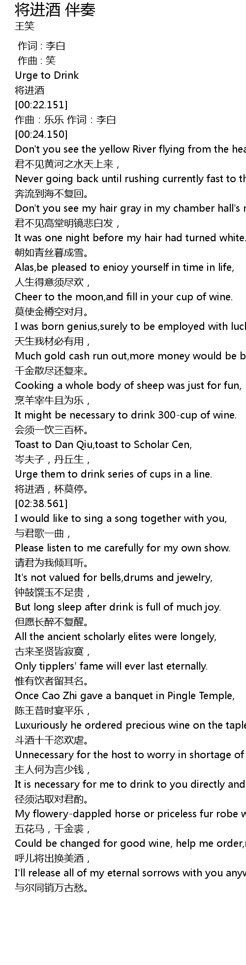 | [02:08.062] | qiāng jìn jiǔ, bēi mò tíng. |