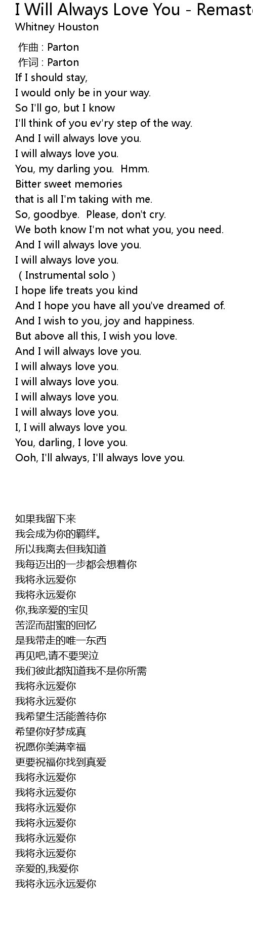 | [04:23.700] | Ooh, I' ll always, I' ll always love you. |