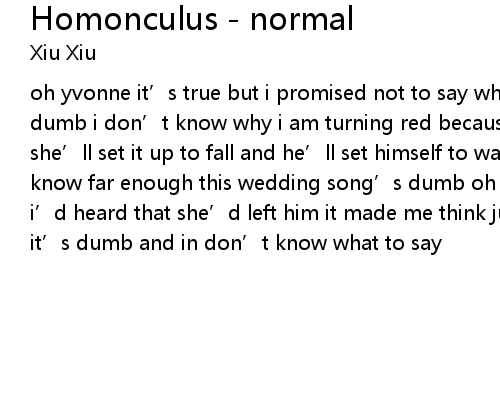 | oh yvonne it' s true but i promised not to say what went down oh yvonne it' s dumb i don' t know why i am turning red because i know you don' t mind she' ll set it up to fall and he' ll set himself to wait far enough away to know far enough this wedding song' s dumb oh yvonne it' s like a wish when i' d heard that she' d left him it made me think just for a second oh yvonne it' s dumb and in don' t know what to say |