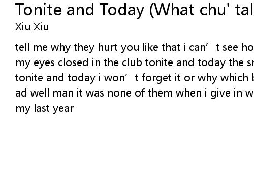 | tell me why they hurt you like that i can' t see how you go on tonite and today my eyes closed in the club tonite and today the smallest kiss in the world tonite and today i won' t forget it or why which boys which girls answered your ad well man it was none of them when i give in will it be ok make me see it' s my last year |