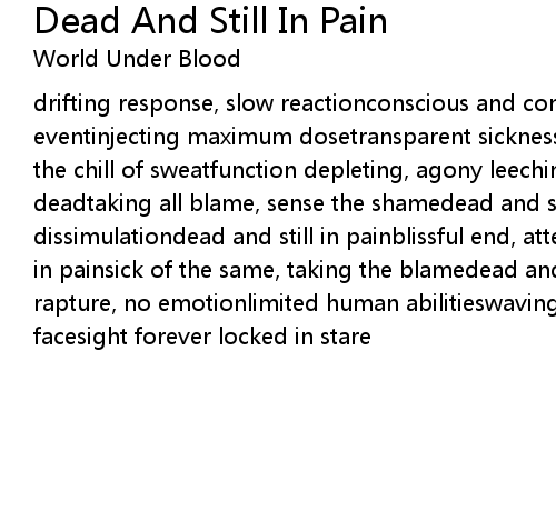 drifting response, slow reactionconscious and comatosesleepwalking through every eventinjecting maximum dosetransparent sicknessvisible riversthe pale of flesh, the chill of sweatfunction depleting, agony leechingeroded figure in pain and... deadtaking all blame, sense the shamedead and still in paina damned creation, dissimulationdead and still in painblissful end, attempted againdead and still in painsick of the same, taking the blamedead and still in pain!my fleeting rapture, no emotionlimited human abilitieswaving my hands in front of my facesight forever locked in stare |