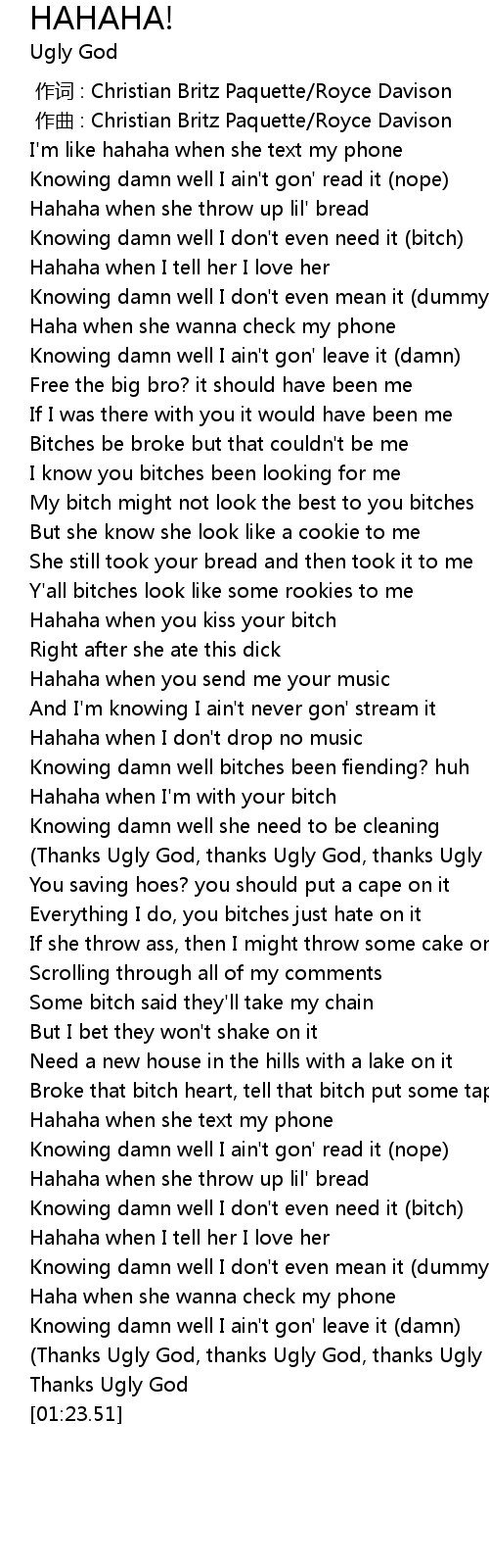 | [00:49.24] | Thanks Ugly God, thanks Ugly God, thanks Ugly God |