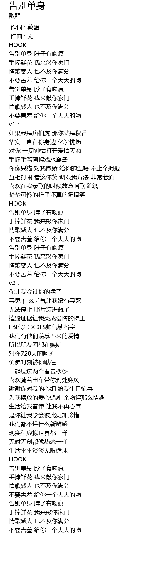 | [00:12.199] | gào bié dān shēn bó zi yǒu wěn hén |