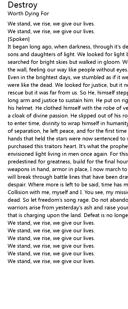 It began long ago, when darkness, through it's deceit captured the hearts of the sons and daughters of light. We looked for light but we found only darkness. We searched for bright skies but walked in gloom. We fumbled like the blind along the wall, feeling our way like people without eyes. We were destined to fall. Even in the brightest days, we stumbled as if it were dark. Among the living we were like the dead. We looked for justice, but it never came. We looked for rescue but it was far from us. So He, himself stepped in to save us, with his long arm and justice to sustain him. He put on righteousness as armor, salvation his helmet. He clothed himself with the robe of vengeance and rapped himself in a cloak of divine passion. He slipped out of his royal garments, left eternity to enter time, divinity to wrap himself in humanity. The sea of glass, the ocean of separation, he left peace, and for the first time felt pain. Because the very hands that held the stars were now sentenced to wear my scars. It was love that purchased this traitors heart. It's what the prophets spoke about when they envisioned light living in men once again. For this reason, I AM LEGEND, predestined for greatness, build for the final hour. I was born for this, with weapons in hand, armor in place, I now march to the beat of a different drum. I will break through battle lines that have been drawn by discouragement and despair. Where more is left to be said, time has met its end. It's now or never. Collision with me, myself and I. You see, my mission today is clear, to wake the dead. So let freedom's song rage. Do not abandon. You're not alone. Last day warriors arise from yesterday's ash and raise your fist with us. We are the army that is charging upon the land. Defeat is no longer and option. It is victory.