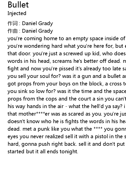 | you' re coming home to an empty space inside of you, there' s no other place. you' re wondering hard what you' re here for, but every night you still walk out that door. you' re just a screwed up kid, who doesn' t know who he is fights the words in his head, screams he' s better off dead. met a punk with a dis wants a fight and now you' re pissed it' s already too late sawed off your hate what did you sell your soul for? was it a gun and a bullet and a chance at revenge? you got props from your boys on the block, a cross to bear that never ends what did you sink so low for? was it the time and the space and the spit in your face? props from the cops and the court a sin you can' t erase he caught you looking his way hands in the air what the hell' d ya say? i know something sad but true that mother er was as scared as you. you' re just a screwed up kid, who doesn' t know who he is fights the words in his head, screams he' s better off dead. met a punk like you what the you gonna do? point the piece at his eyes you never realized sell it with a pistol in the sack. they push you so hard, gonna push right back. sell it and don' t put up a fight your life has just started but it all ends tonight. |