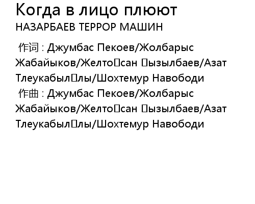| [00:00.00-1] | 作曲 : Джумбас Пекоев/Жолбарыс Жабайыков/Желтоқсан Қызылбаев/Азат Тлеукабылұлы/Шохтемур Навободи |