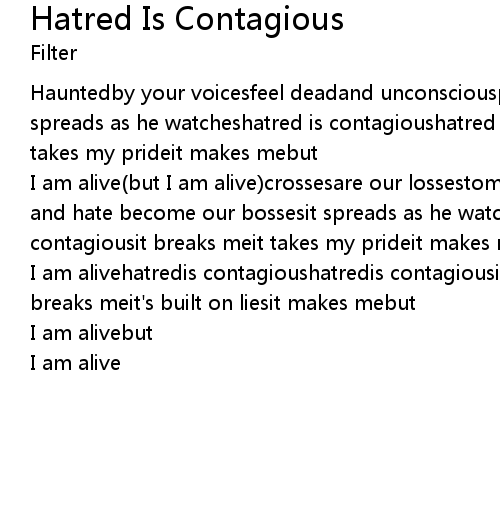 Hauntedby your voicesfeel deadand unconsciouspain and hate become our processit spreads as he watcheshatred is contagioushatred is contagiousit breaks meit takes my prideit makes mebut |