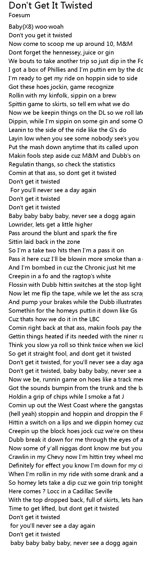 | [03:46.880] | Don't get it twisted, baby baby baby, never see a dogg again |