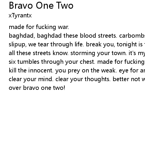 | baghdad, baghdad these blood streets. carbombs and gunshots. you can't blink. slipup, we tear through life. break you, tonight is the night. urban decay is all these streets know. storming your town. it's my life over yours. five five six tumbles through your chest. made for fucking war. best, bring your best. you kill the innocent. you prey on the weak. eye for an eye. judgment day we meet. clear your mind. clear your thoughts. better not wait. I'm coming for you. game over bravo one two! |
