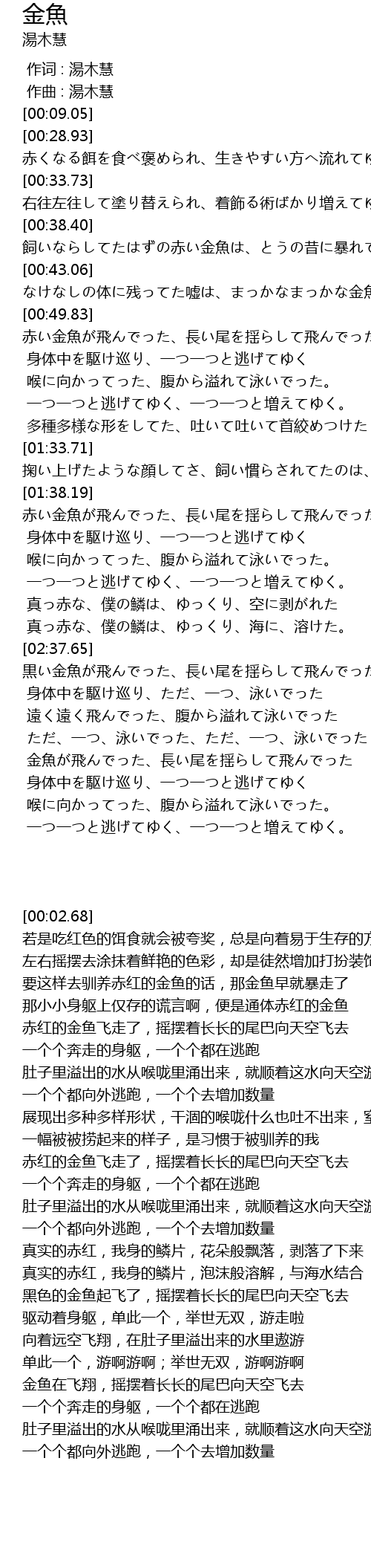 | [00:43.06] | なけなしの体に残ってた嘘は、まっかなまっかな金魚です。 |