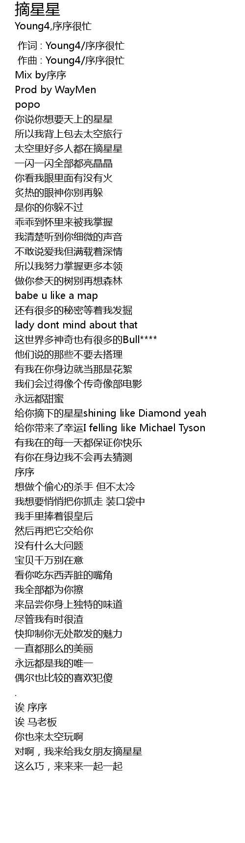 | [00:56.680] | gěi nǐ zhāi xià de xīng xīng shining like Diamond yeah |