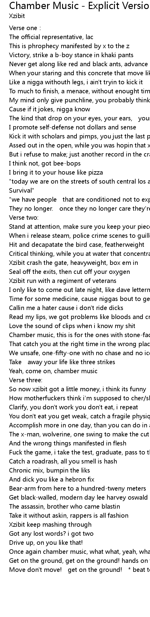 | Once again chamber music, what what, yeah, what the deal? it' s xzibit. | |