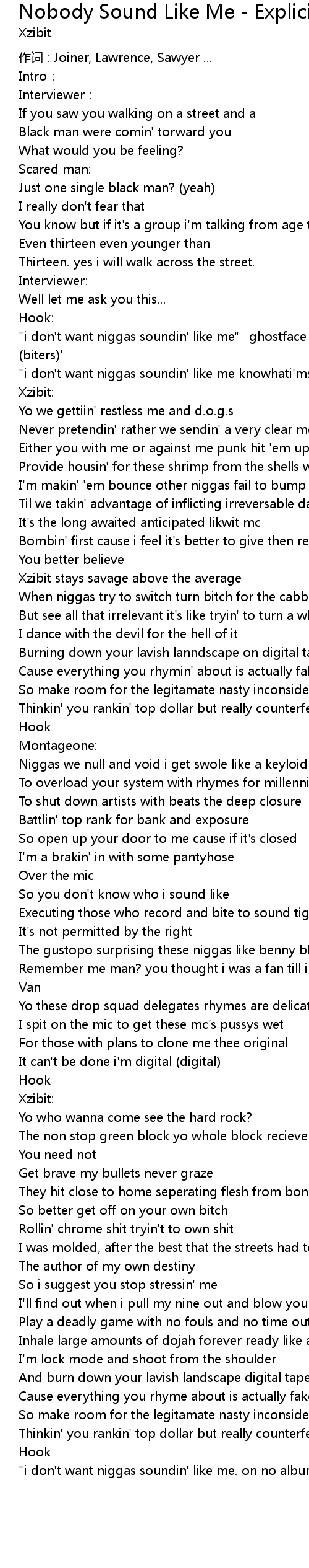 | "i don't want niggas soundin' like me knowhati'msayin'?" (x2) | |