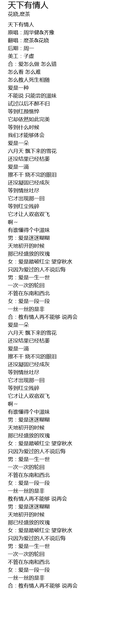 | [00:01.186] | tiān xià yǒu qíng rén |