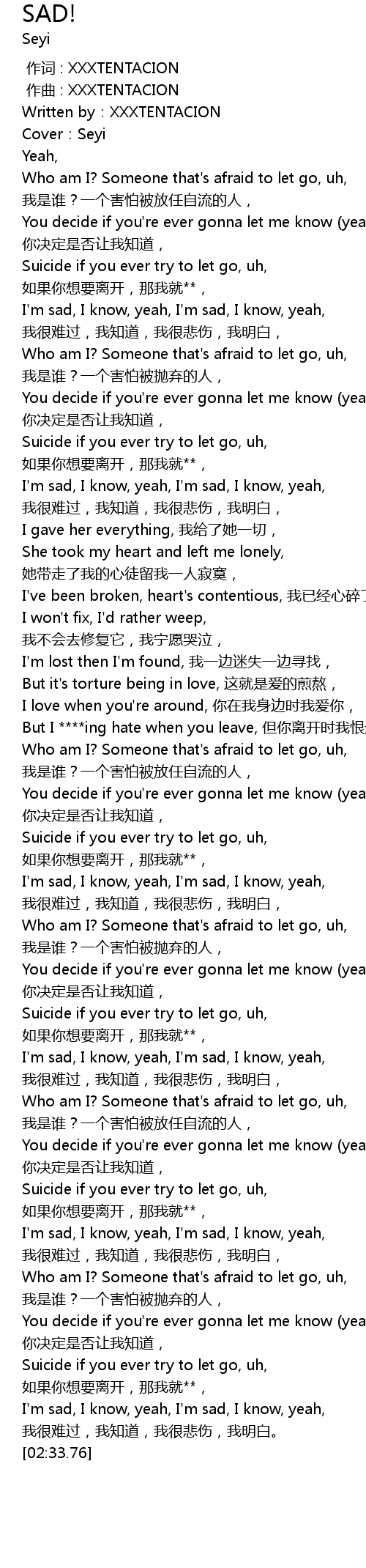 | [02:30.52] | I'm sad, I know, yeah, I'm sad, I know, yeah, 我很难过,我知道,我很悲伤,我明白。 |