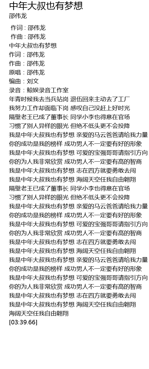 | [03:23.44] | 我是中年大叔我也有梦想 海阔天空任我自由翱翔 |