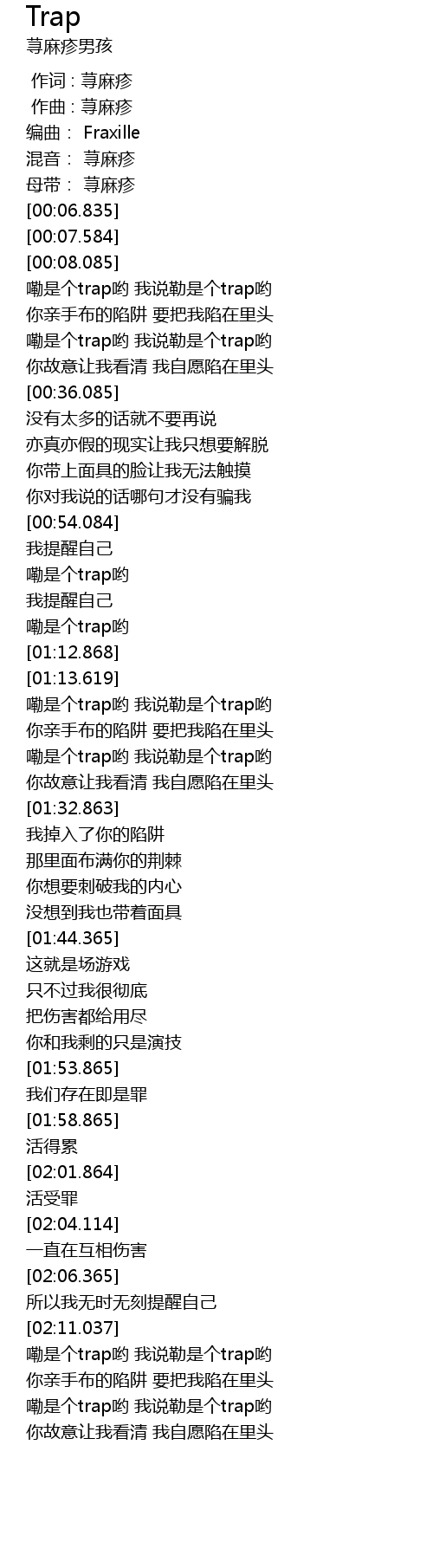 | [02:15.787] | 嘞是个trap哟 我说勒是个trap哟 |