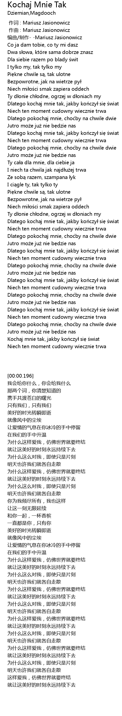 | [03:42.785] | Kochaj mnie tak, jakby ko czy si wiat |