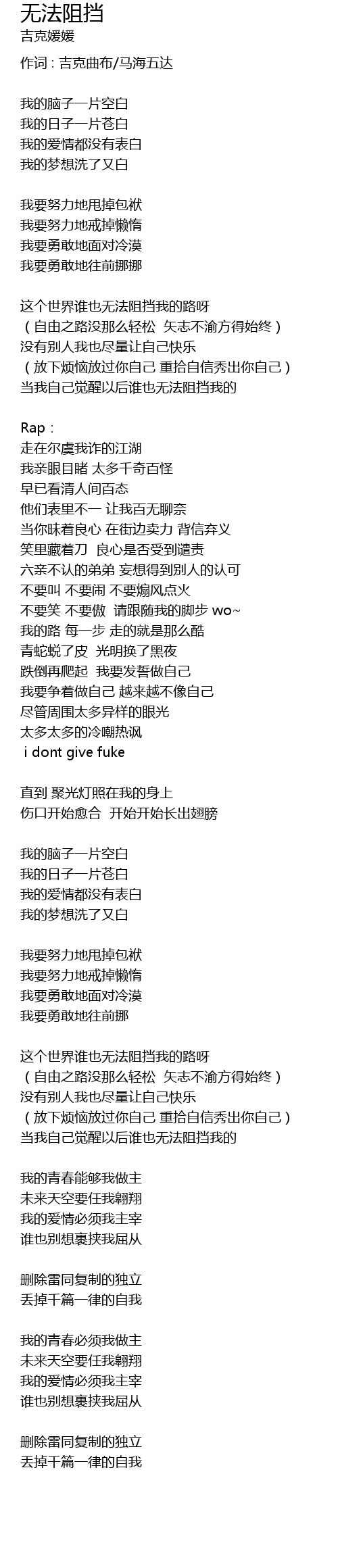 | zhè gè shì jiè shuí yě wú fǎ zǔ dǎng wǒ de lù ya | |